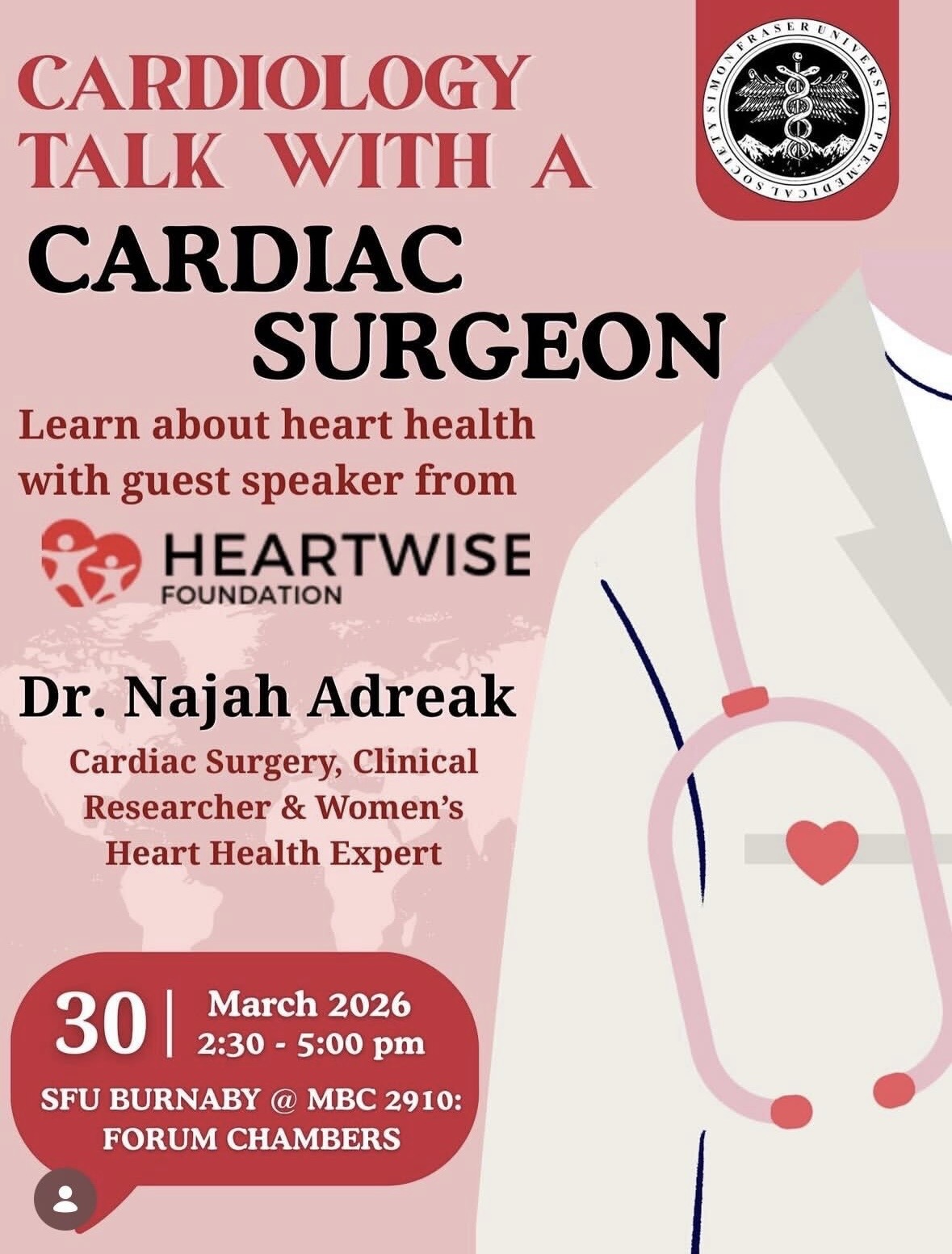 Join us for an engaging and insightful cardiology talk hosted by the HeartWise Foundation at Simon Fraser University. This special event features Dr. Najah Adreak, a distinguished cardiac surgeon, clinical researcher, and expert in women’s heart health.