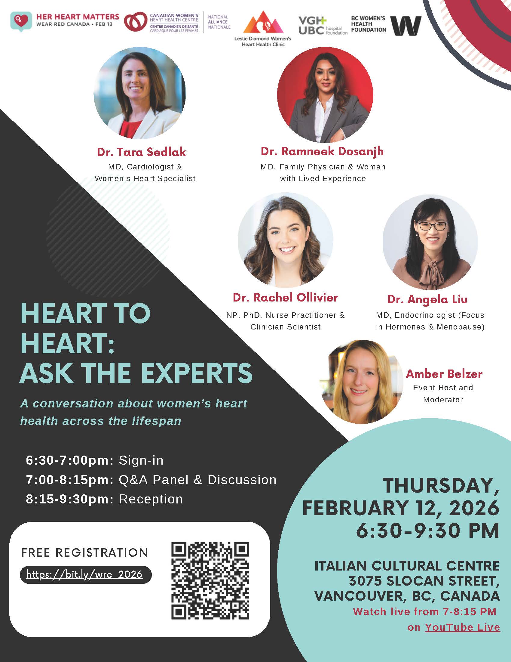 Join us for an interactive Q&A panel discussion focused on women’s heart health, featuring four expert voices in cardiovascular care. Our panel will share insights, answer questions, and discuss key issues impacting women’s heart health. This event is part of the national Wear Red Canada initiative, held annually in February since 2018, which aims to raise awareness about women’s heart health and highlight the importance of prevention, early detection, and equitable access to care.